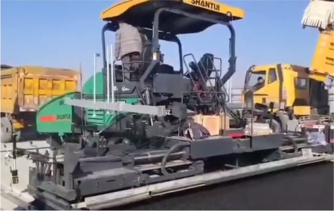 山推9米液壓伸縮攤鋪機助力山東某縣道建設,道路瀝青施工,攤鋪厚度為3cm,攤鋪寬度為7.5m,與某進口品牌攤鋪機雙機聯(lián)鋪,同臺競技,在作業(yè)質量、作業(yè)效率、操縱方式等方面,客戶非常滿意。