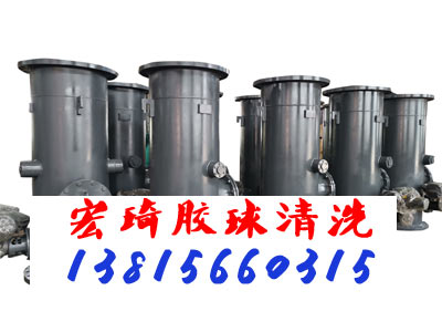 我公司生產的凝汽器膠球清洗裝置,適用于50~600MW汽輪機發電機組,膠球清洗裝置主要由膠球泵、收球網、裝球室、電控柜以及附屬件等設備組成。其工作原理是:膠球泵啟動,借助水流的作用將直徑大于冷凝管內徑的海綿膠球擠進凝汽器冷凝管,經收球網收球再進入裝球室。通過這一過程,膠球對冷凝管進行清洗,維持冷凝管內壁清潔,保證凝汽器設計換熱效率不下降,從而維持凝汽器的端差和汽輪機背壓;同時避免冷凝管內壁腐蝕,改善運行條件,延長機組壽命。